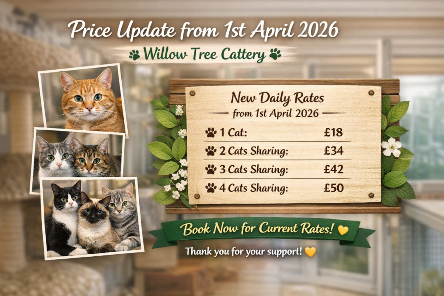 If you wish to view the cattery, please arrange an appointment by calling us directly. When booking, ensure you choose the correct check-in and check-out times, as pick-ups and drop-offs outside of these times may incur an additional charge if not agreed upon prior to booking